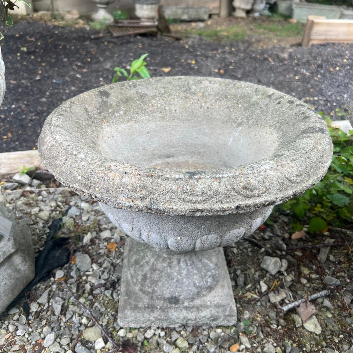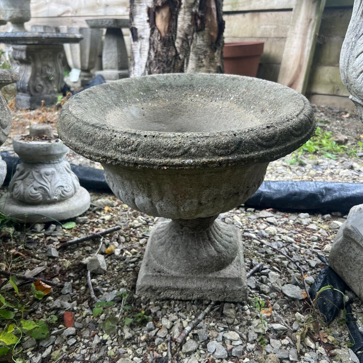 Here we have this Classic Garden Urn in stock and on display in our garden features area here at Authentic Reclamation. This classic garden urn is in good condition with age-related wear, which can be seen in the images. This classic garden urn has a wide flared bowl with a detailed rim and a sturdy square base, making it an attractive addition to any outdoor space. Its traditional proportions and decorative fluting around the body give this classic garden urn timeless character, ideal for planting flowers or standing as an ornamental feature in a garden or courtyard.