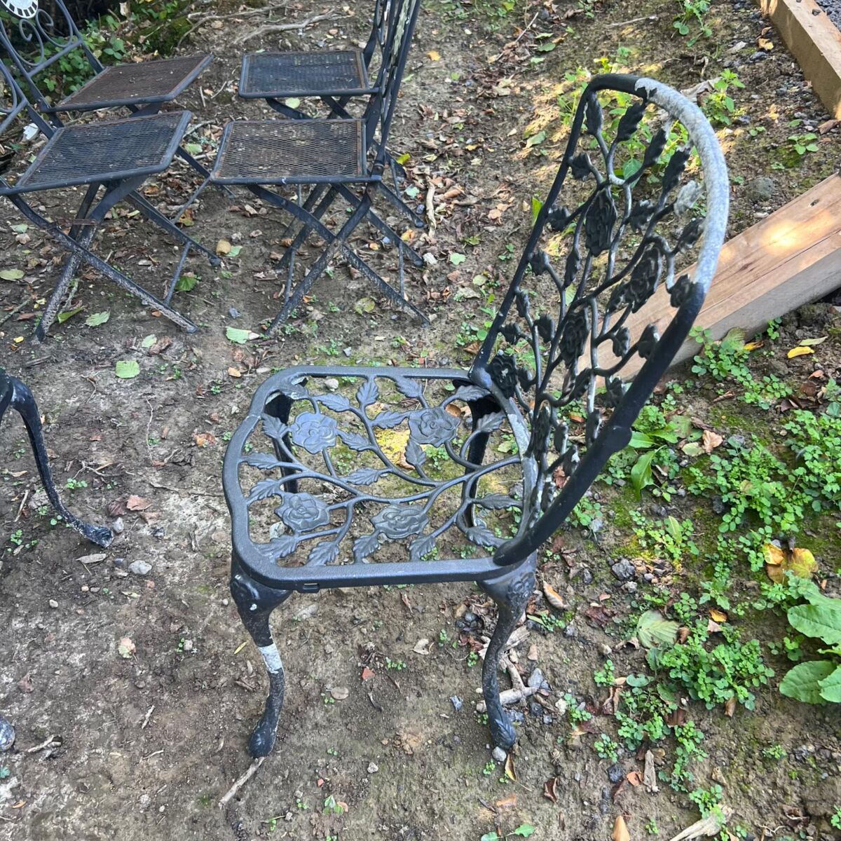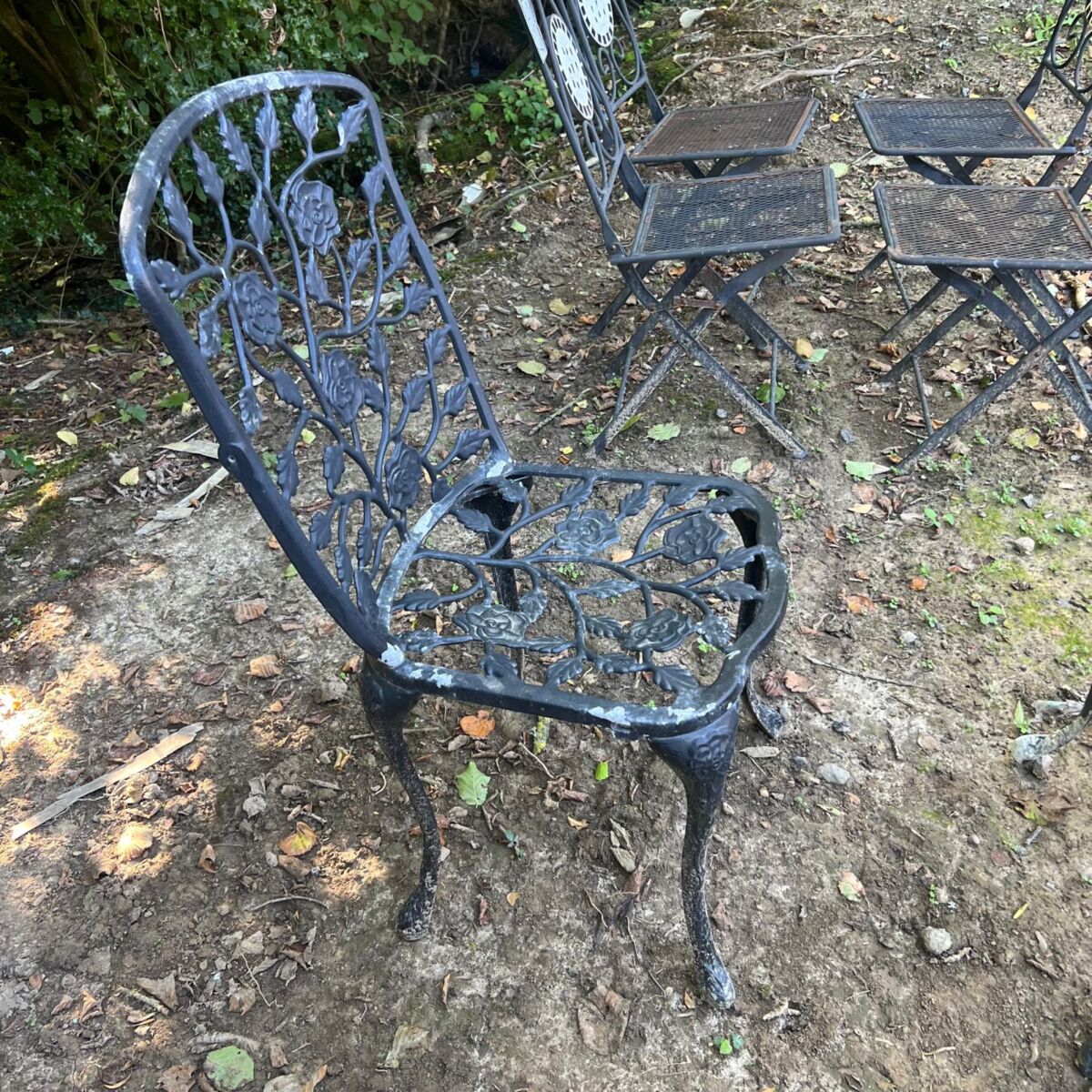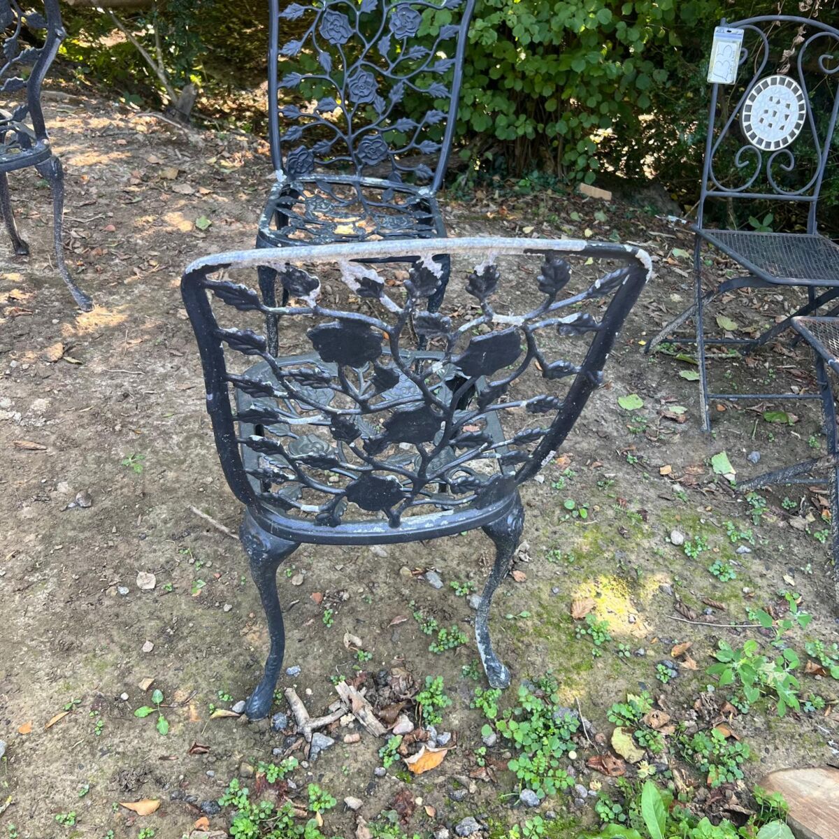 Here we have these Decorative Roseback Chairs in stock and on display in our garden features area here at Authentic Reclamation. These decorative roseback chairs are in good condition with areas of flaking paint and light wear, which can be seen in the images. These decorative roseback chairs feature a graceful climbing rose design, the stems and blooms intertwining across the back and seat in flowing relief.