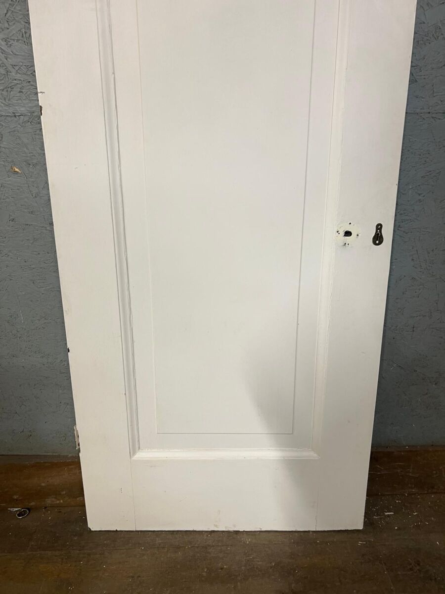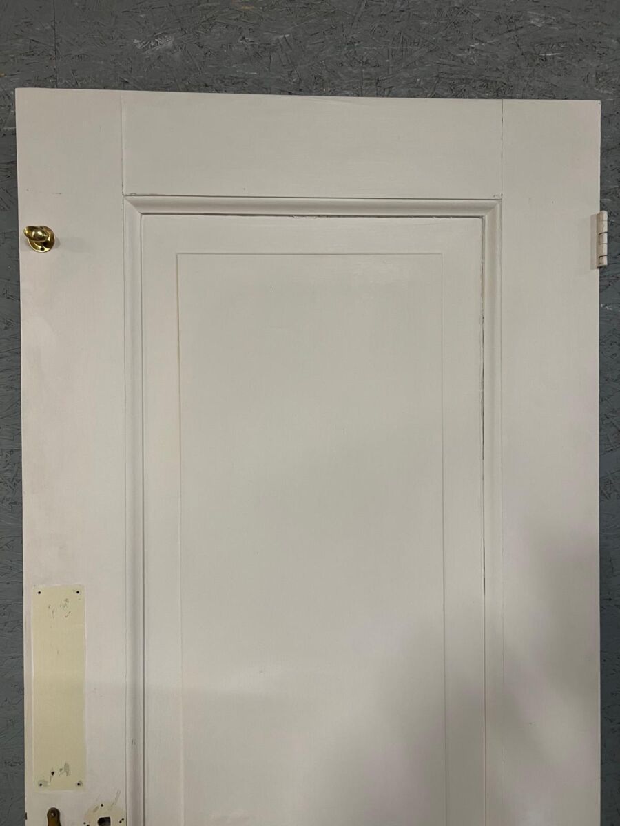 The broad central panel is beautifully proportioned, framed by subtle moulding and grounded by a deep lower rail that gives this elegant 1 panel door a reassuring sense of weight and structure. Finished in a soft, neutral paint tone, this elegant 1 panel door offers a clean canvas while still retaining the gentle character that only an older door can bring. Brass furniture remains in place, adding a touch of warmth against the painted surface and hinting at its earlier life.