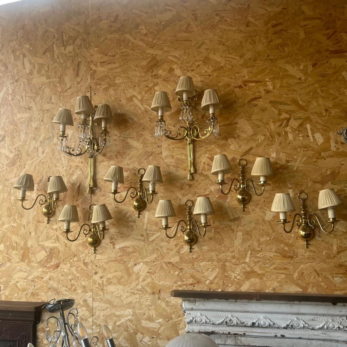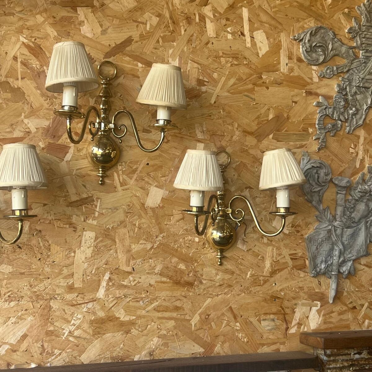 Here we have these Elegant Brass Wall Lights in stock and on display in our showroom area here at Authentic Reclamation. These elegant brass wall lights are in good condition with minor surface wear consistent with age, which can be seen in the images. These elegant brass wall lights have a timeless double arm design with cream pleated shades and graceful curved detailing. The glossy brass backplate catches the light beautifully, casting a soft, golden glow that instantly warms and elevates any room.