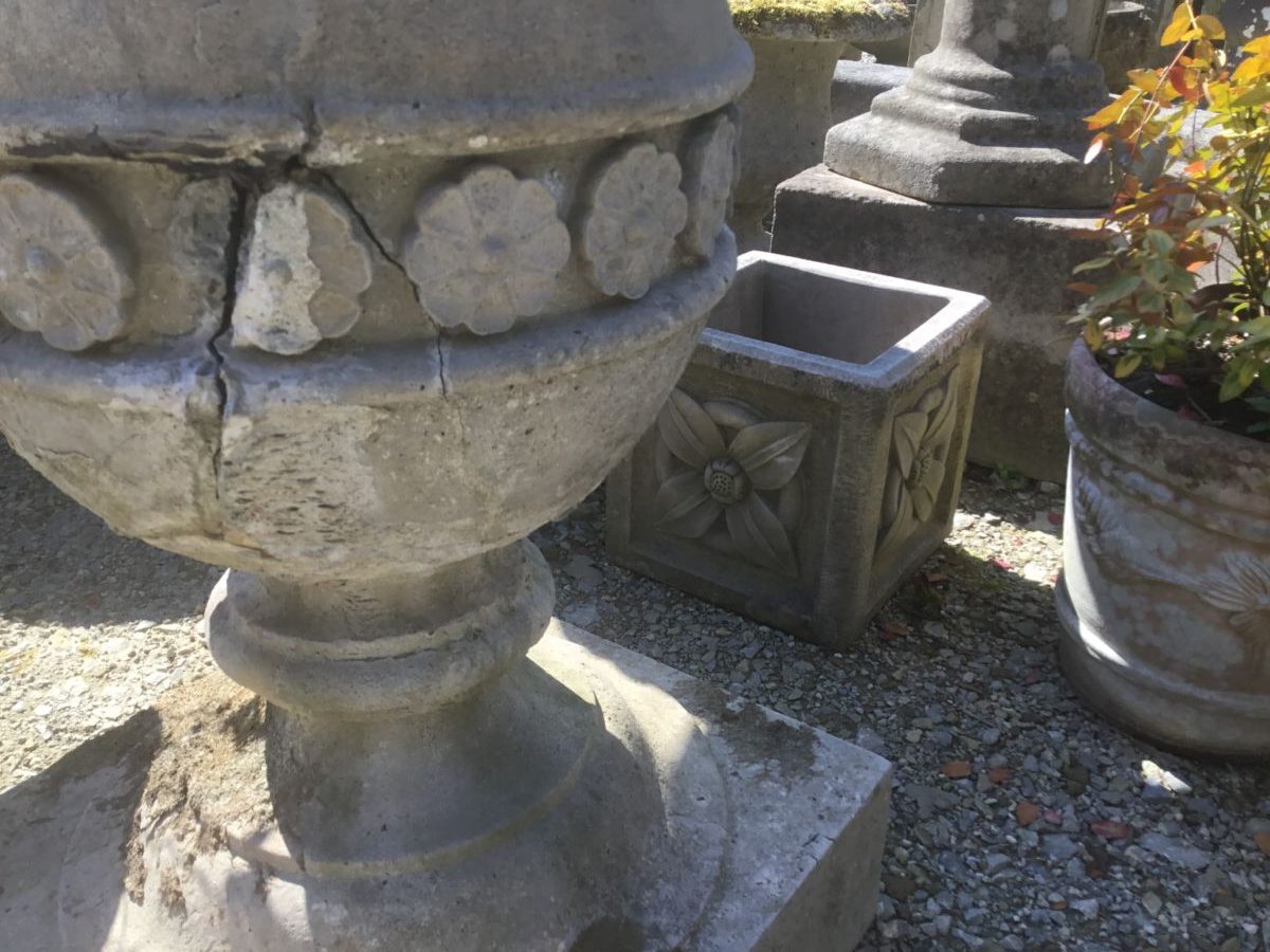 Here we have a Flowery Urn Base in stock and available here at our yard at Authentic Reclamation. This Flowery Urn Base has an imposing shape with flowers surrounding the middle the urn base is badly damaged.