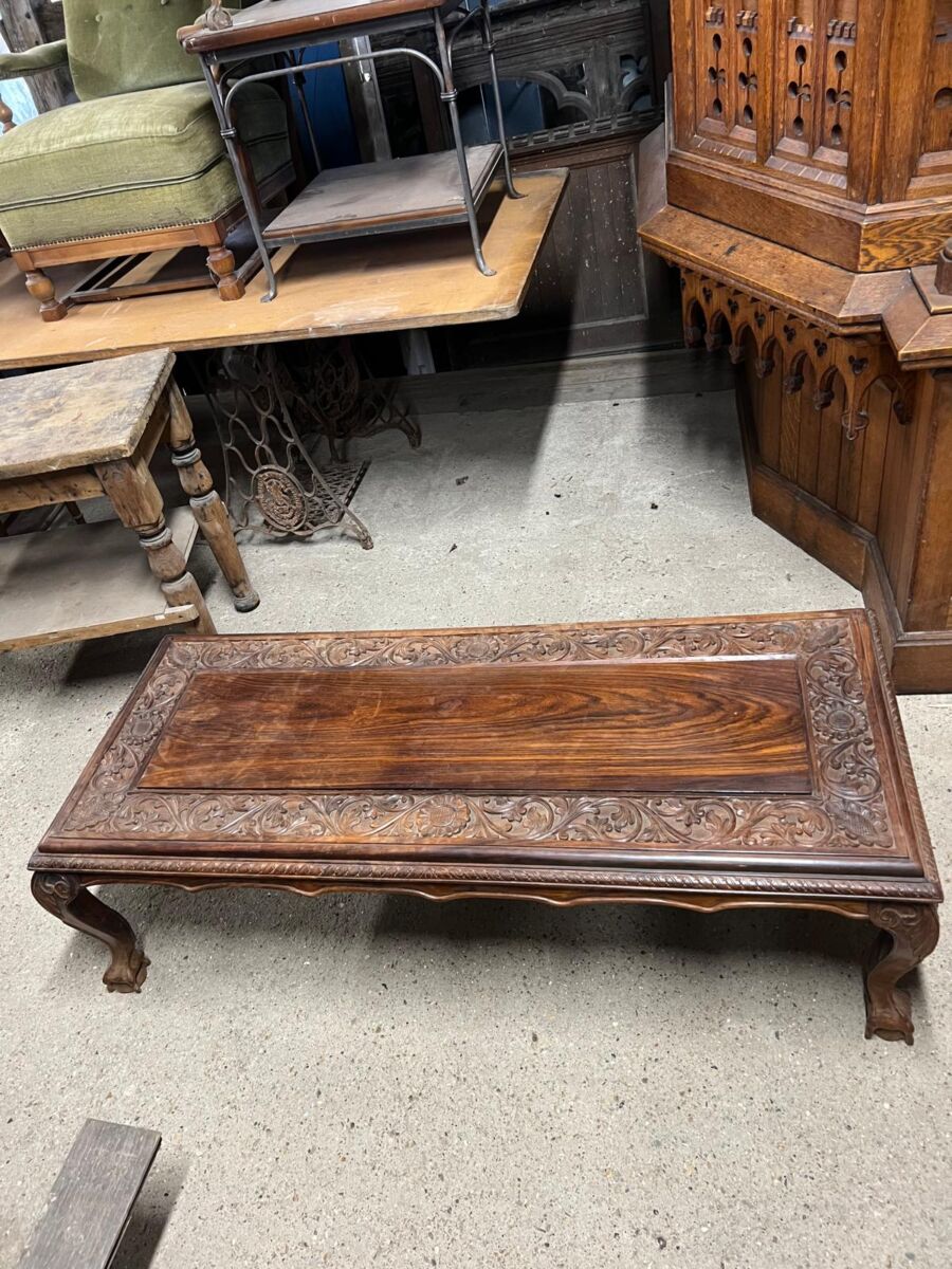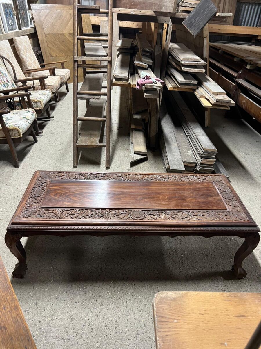 Here we have this Intricately Carved Hardwood Table in stock and on display in our showroom area here at Authentic Reclamation. This table is in good condition, with a few age related marks.