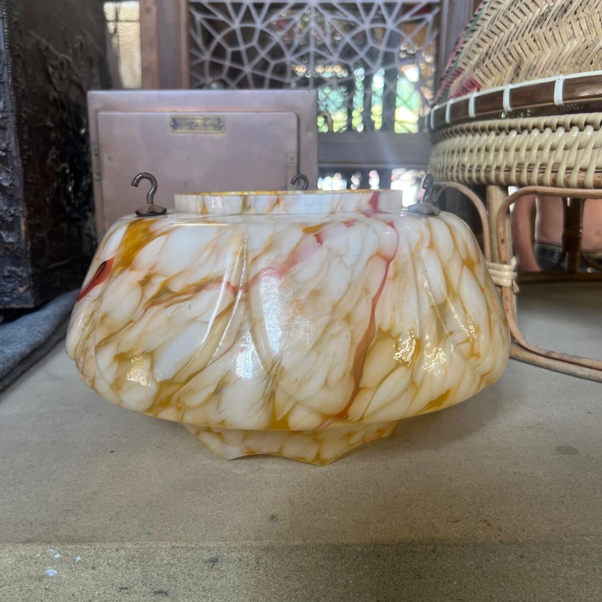 Here we have this Striking Marbled Glass Light Shade in stock and on display in our showroom area here at Authentic Reclamation. This marbled glass light shade is in good condition with minor signs of age and use, which can be seen in the images. This marbled glass light shade features rich swirls of amber, cream, and soft red tones, giving it a warm and distinctive character. If this marbled glass light shade doesn’t interest you, we offer a wide range of lighting throughout our yard which can be viewed online or come in today!