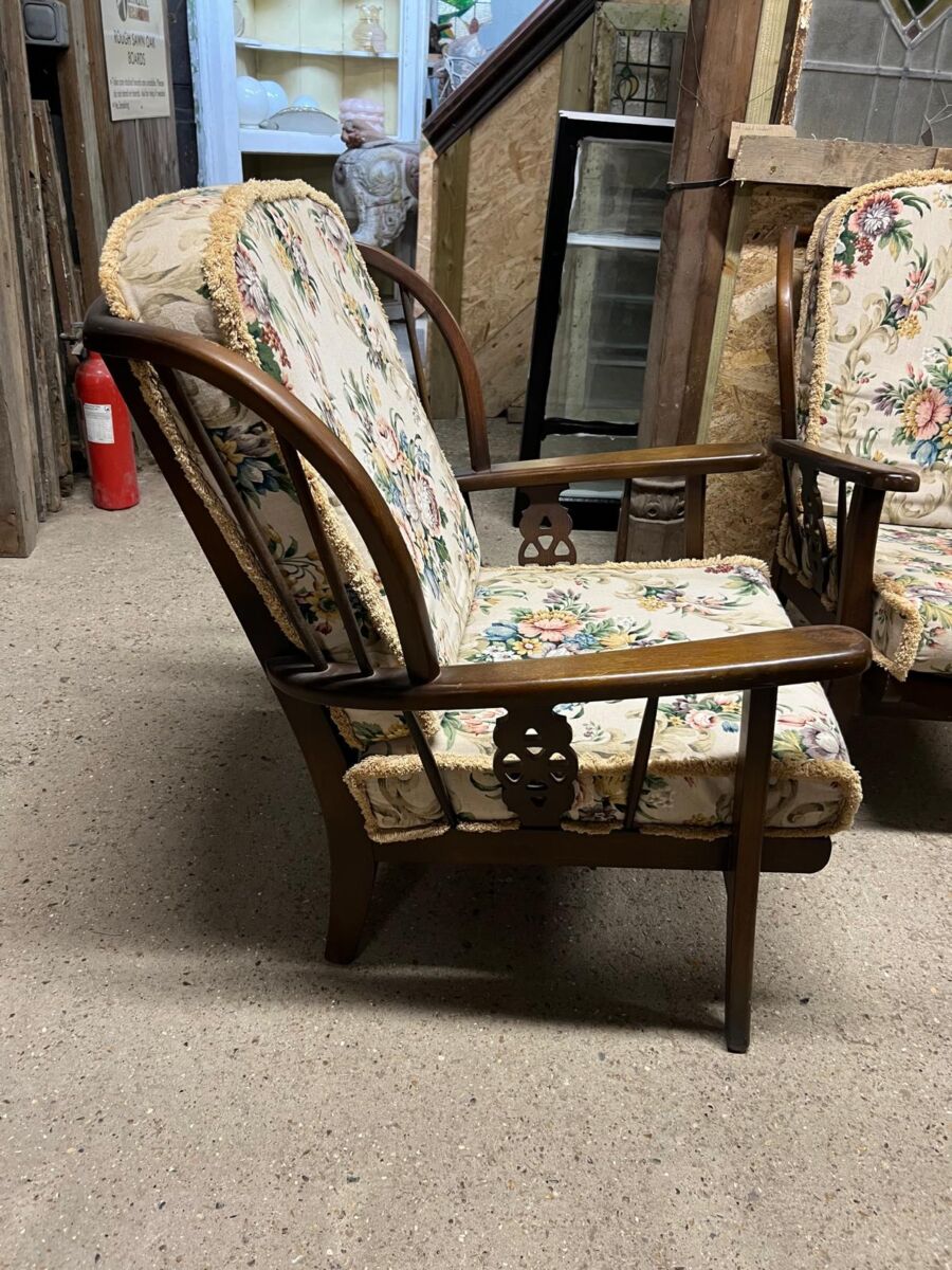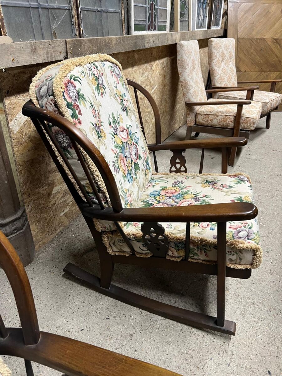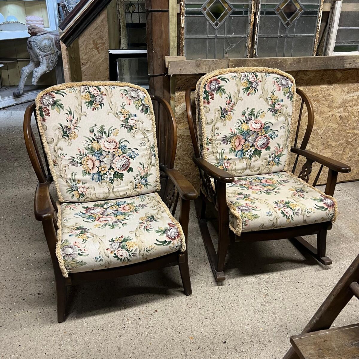 Here we have this Matching Floral Arm Chair and Rocking Chair in stock and on display in our showroom area here at Authentic Reclamation. Both of these chairs are in good condition.
