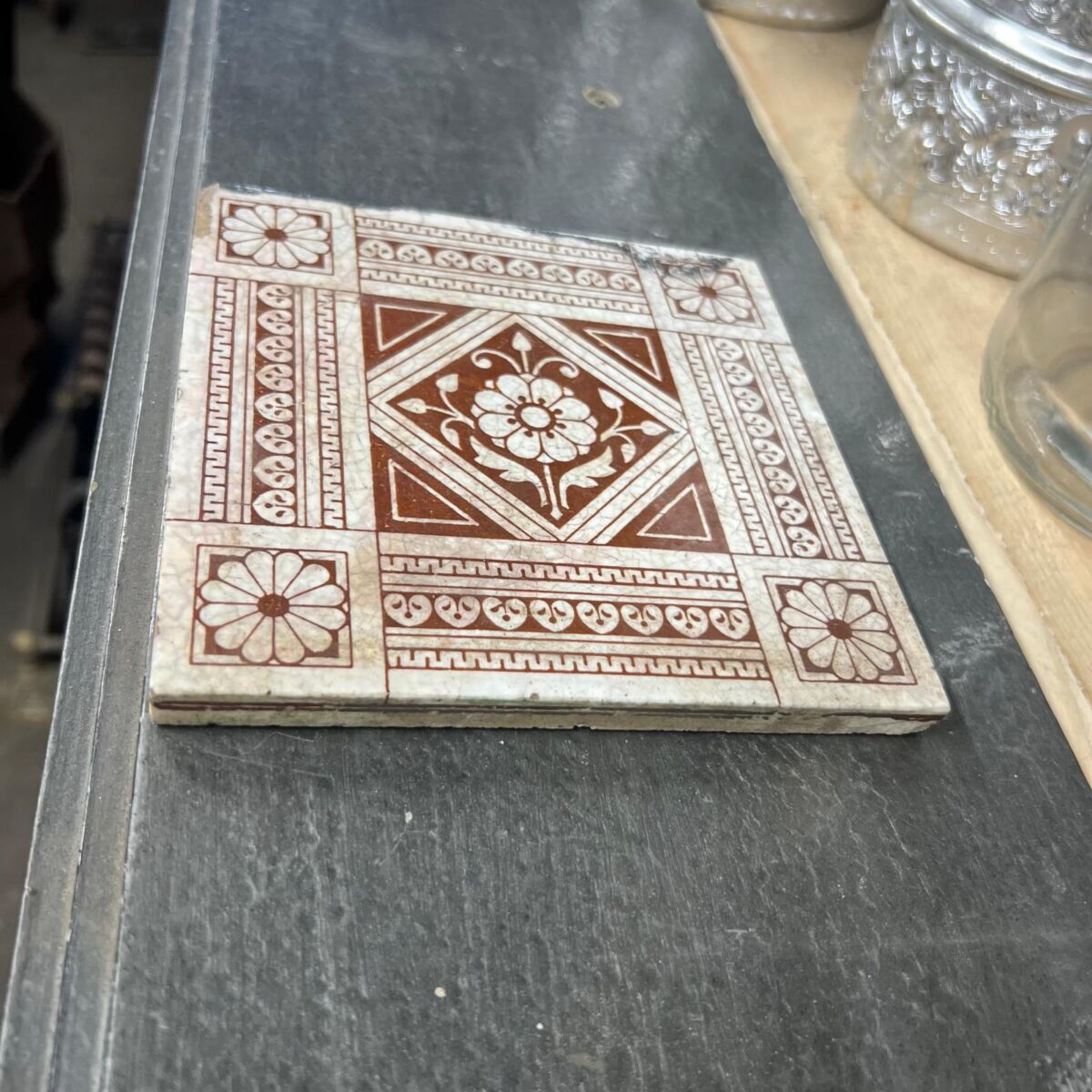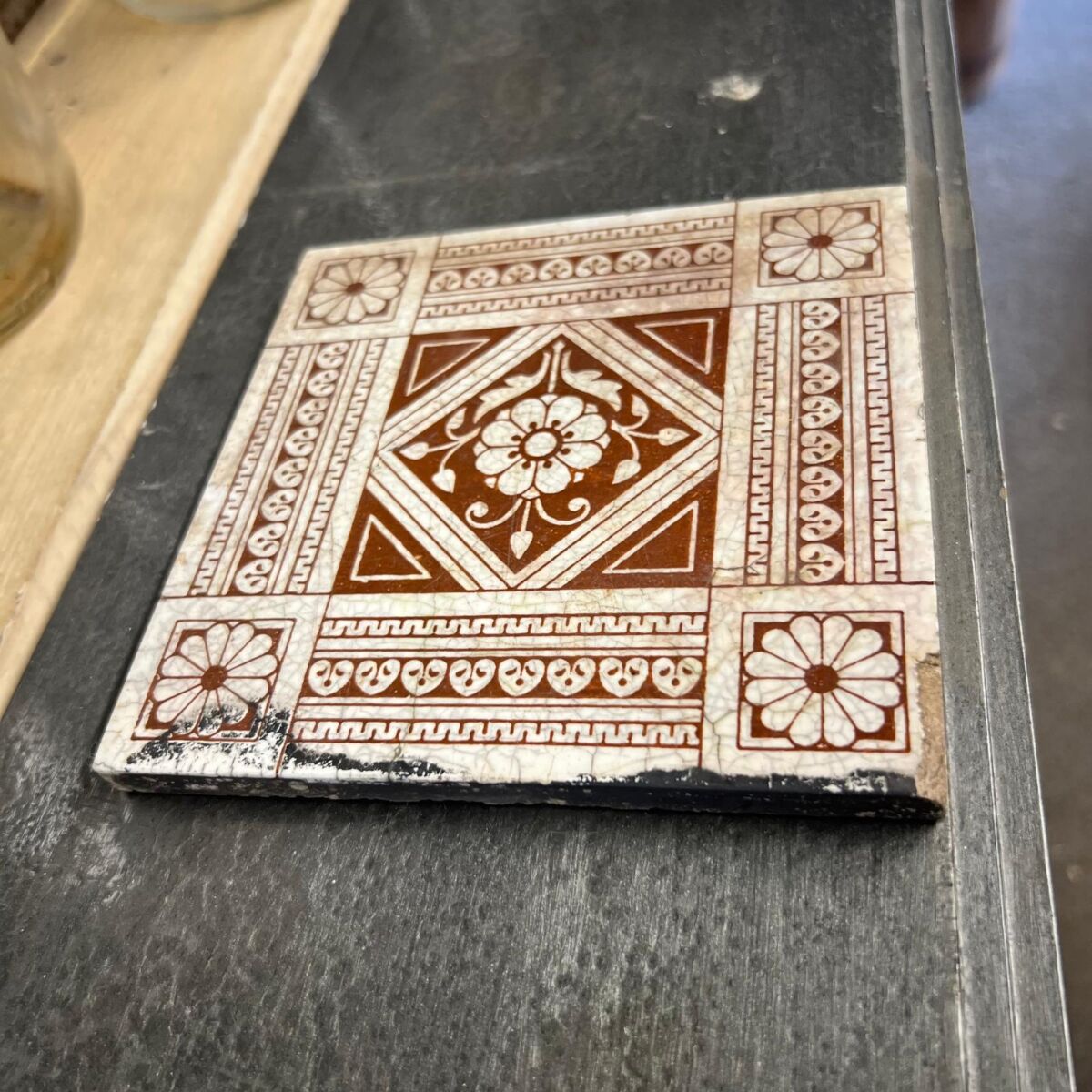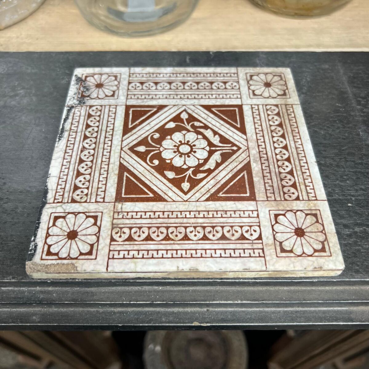 Here we have this Mintons Floral Tile, featuring a bold geometric layout with a central floral medallion framed by decorative borders and daisy corner motifs. The brown transfer design on a pale ground of this Mintons Floral Tile captures the Victorian taste for symmetry and ornamental detail, making this an attractive piece for collectors or display.