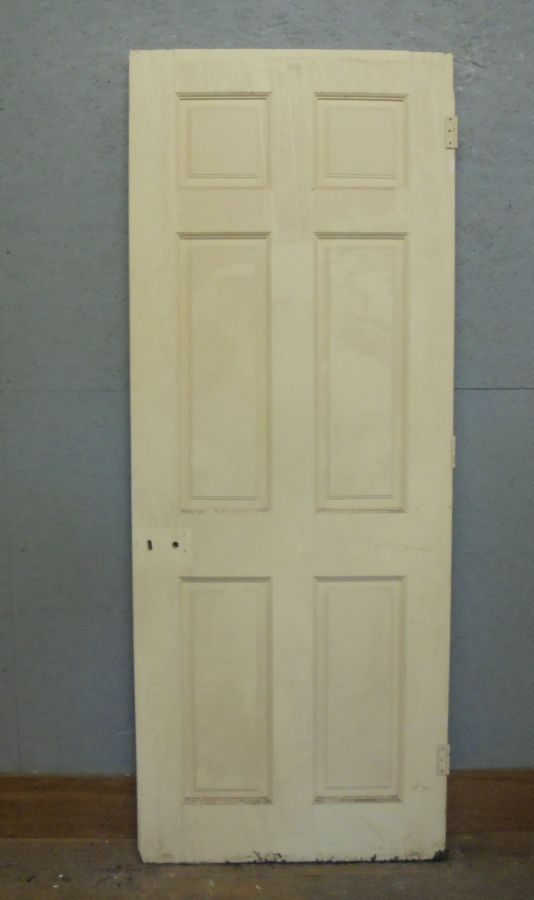 A solid pine reclaimed 6 panel door, painted cream, beaded on both sides. The door has a few chips and notches out. We have a wide selection of other reclaimed doors available at Authentic Reclamation. They vary in dimensions and we have thousands to choose from. We recommend you use the door search option and include plenty of tolerance with dimensions to get the most results. In the storehouse we stock them in mm height order.