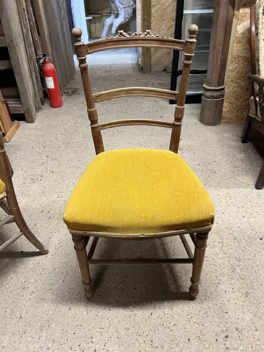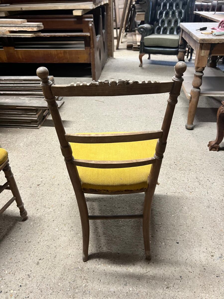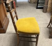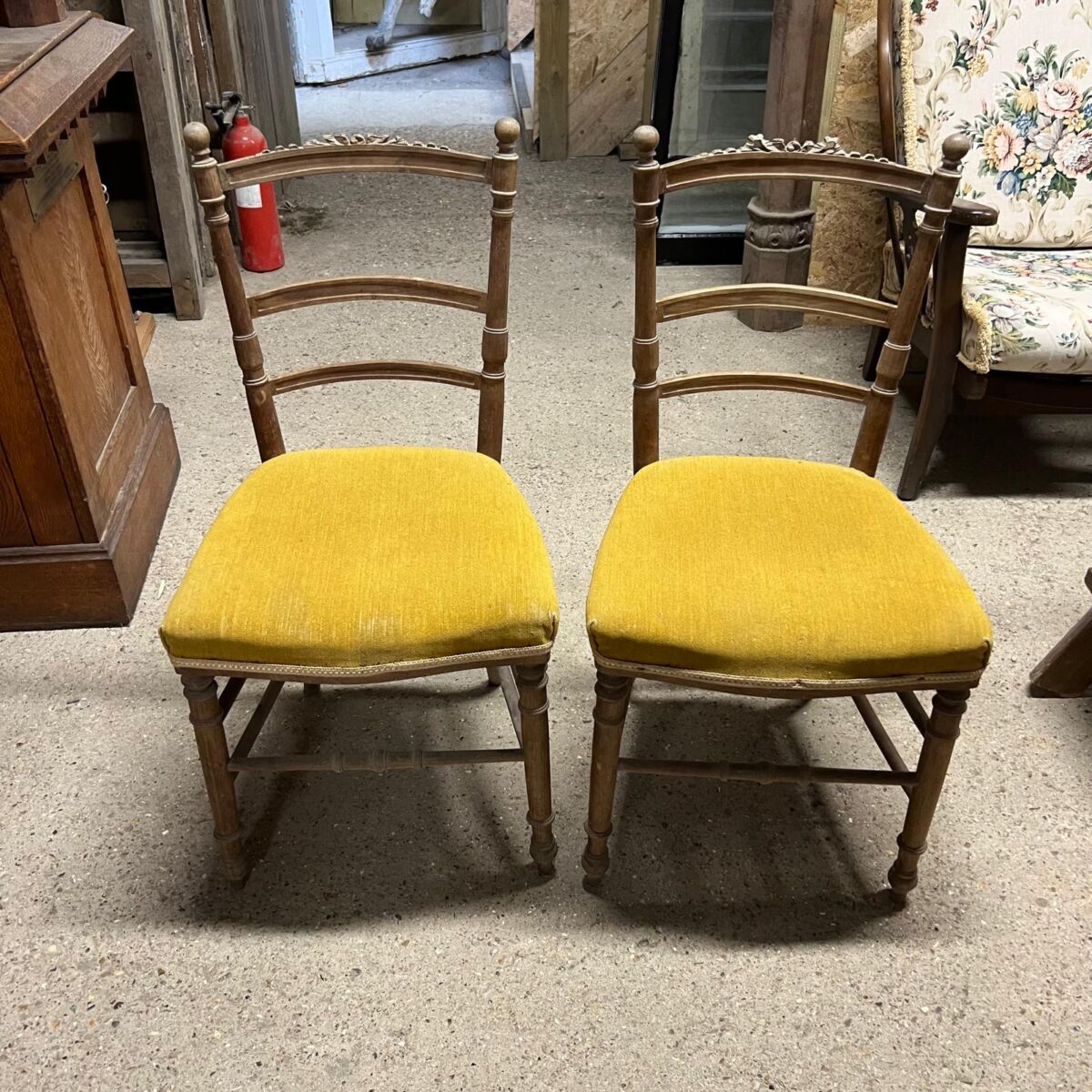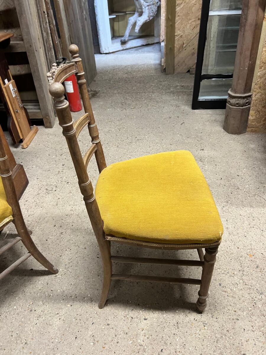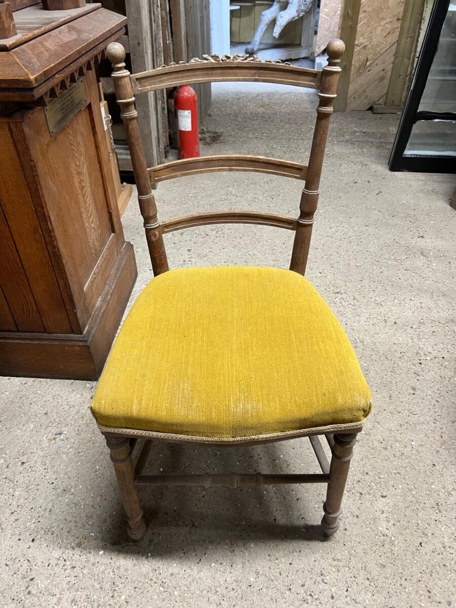 Here we have this Pair of Wooden Chairs with Mustard Upholstery in stock and on display in our showroom area here at Authentic Reclamation. Both of these chairs are in good condition.