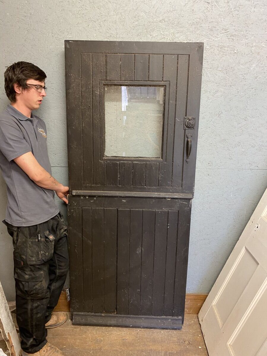 Reclaimed Stable Painted Door in stock and on display in our door showroom at Authentic Reclamation. We have a wide range of doors of all different shapes and styles here within our yard. This stable door is painted Black on the front and white on the back. This stable door as a glazed section in the top section and lovely door furniture.