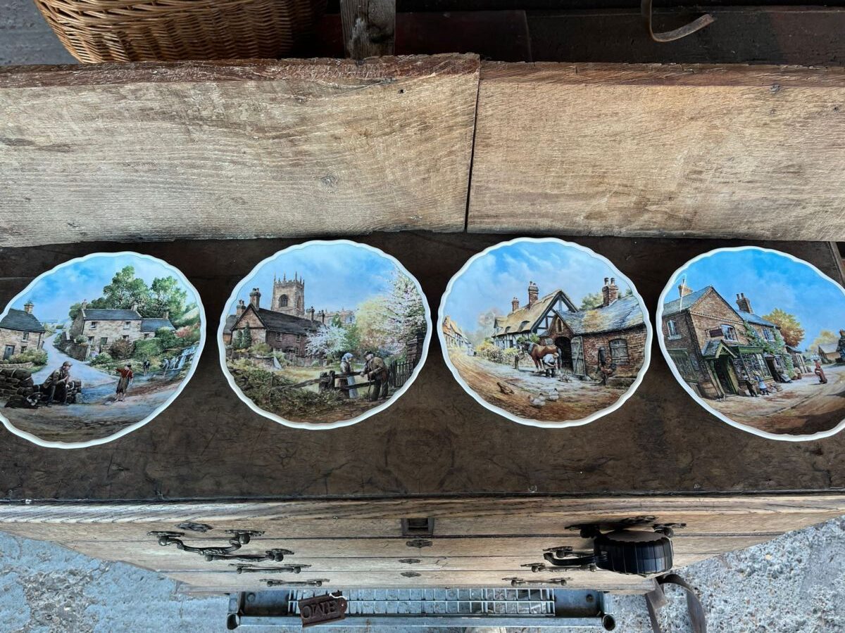 A charming set of Royal Doulton collector plates, each featuring a detailed village scene full of colour and character. The artwork captures classic rural life, cottages, churchyards, stone streets, and everyday moments.