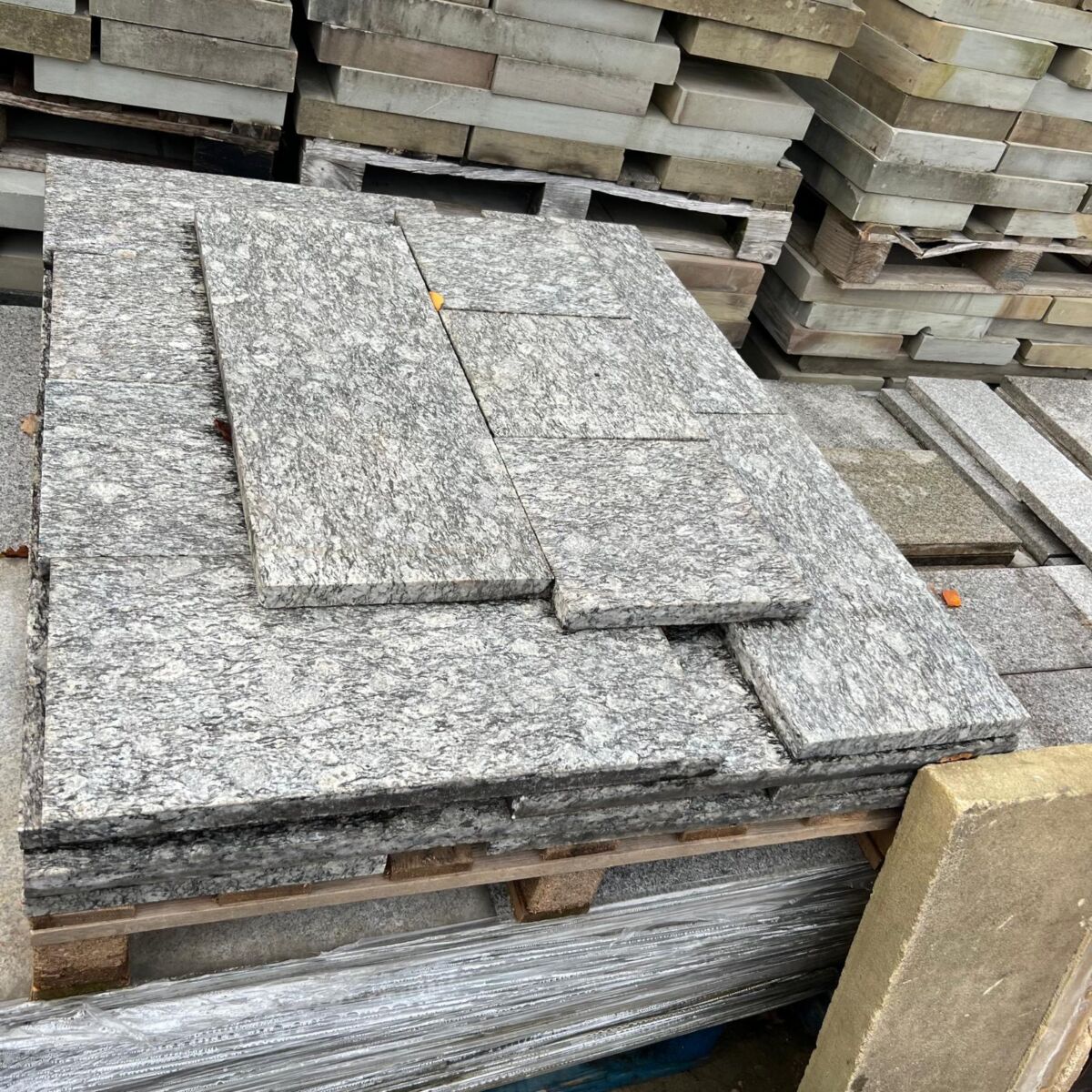 A refined selection of speckled granite paving, reclaimed and ready for reuse. Each slab features a beautifully mottled mix of silvery greys and soft charcoal tones, giving the surface a distinctive crystalline shimmer under natural light. Strong, elegant, and enduring, these stones are ideal for patios, steps, or pathways that call for a more contemporary finish while still offering the character and substance of reclaimed material.