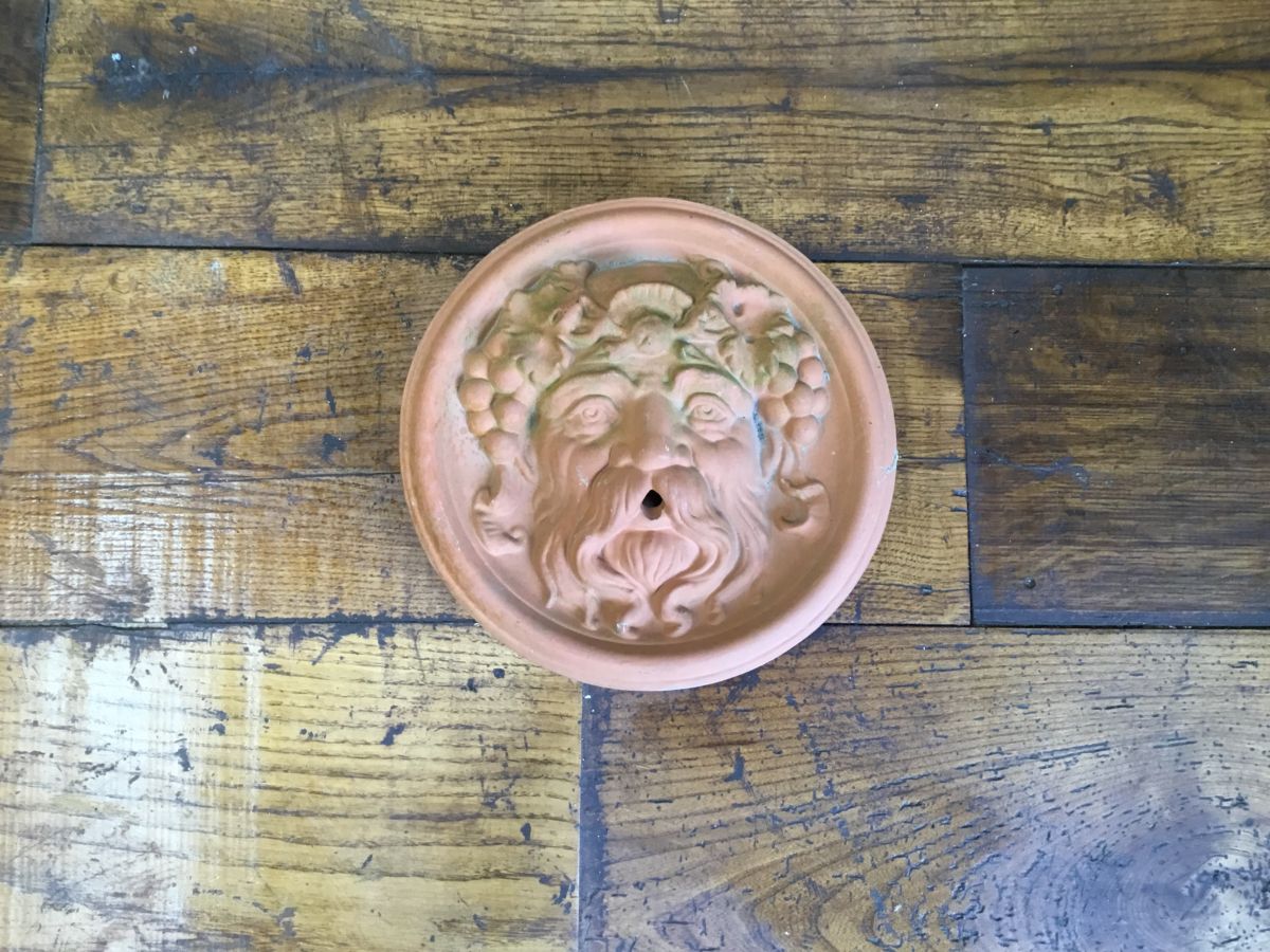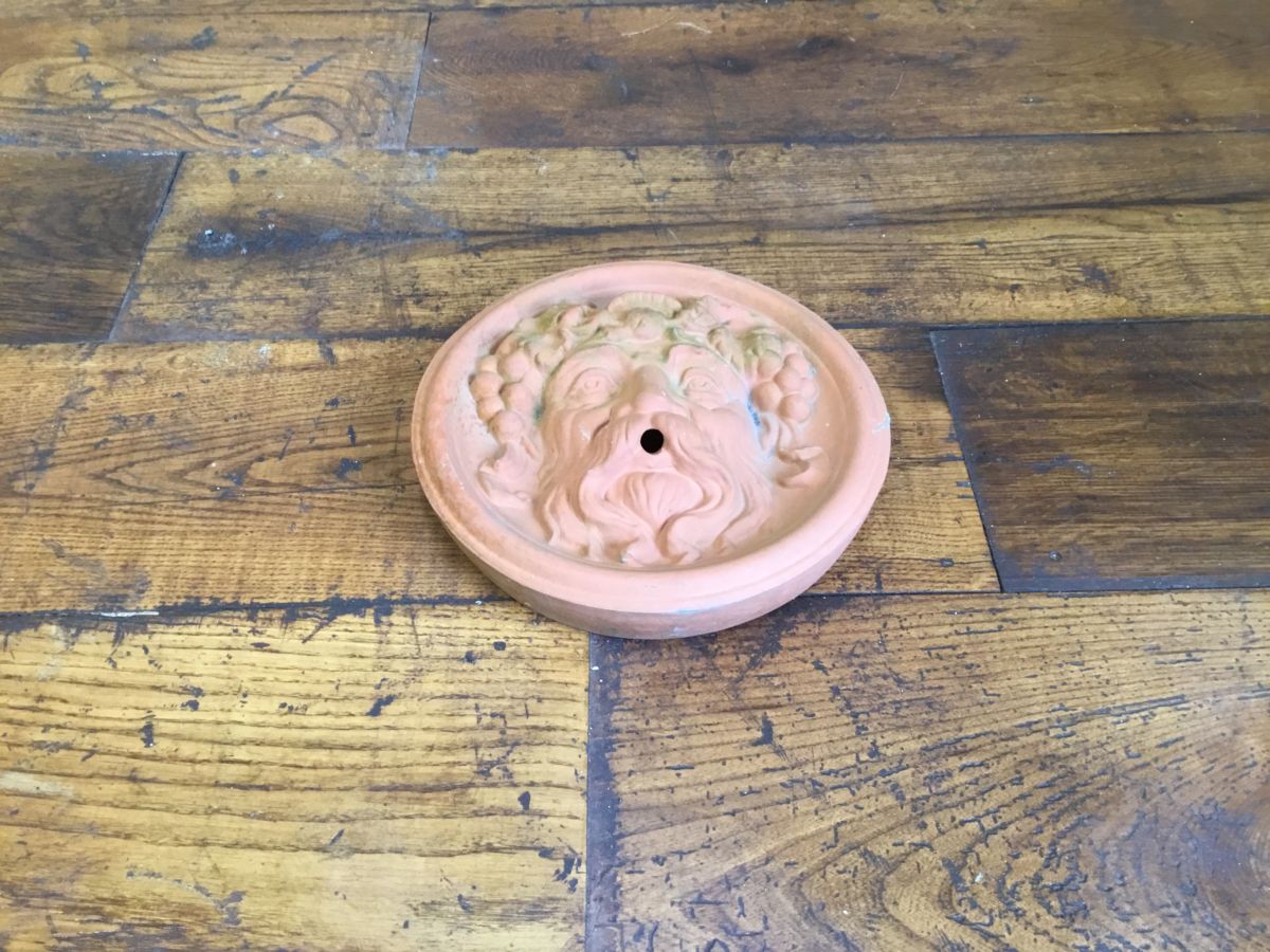 Terracotta Green Man in stock and on display in our reclaimed garden features yard.
