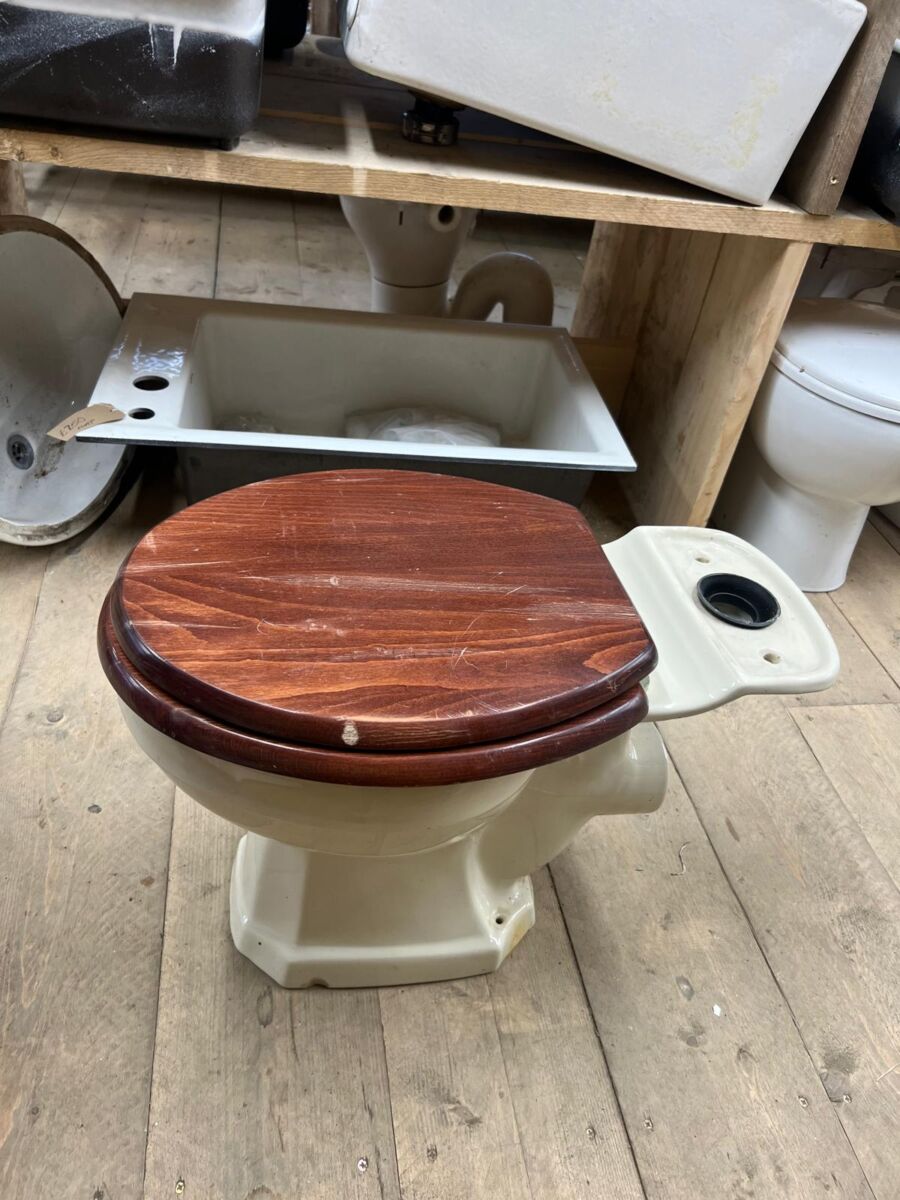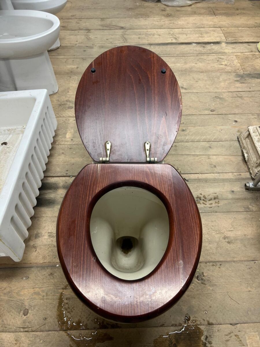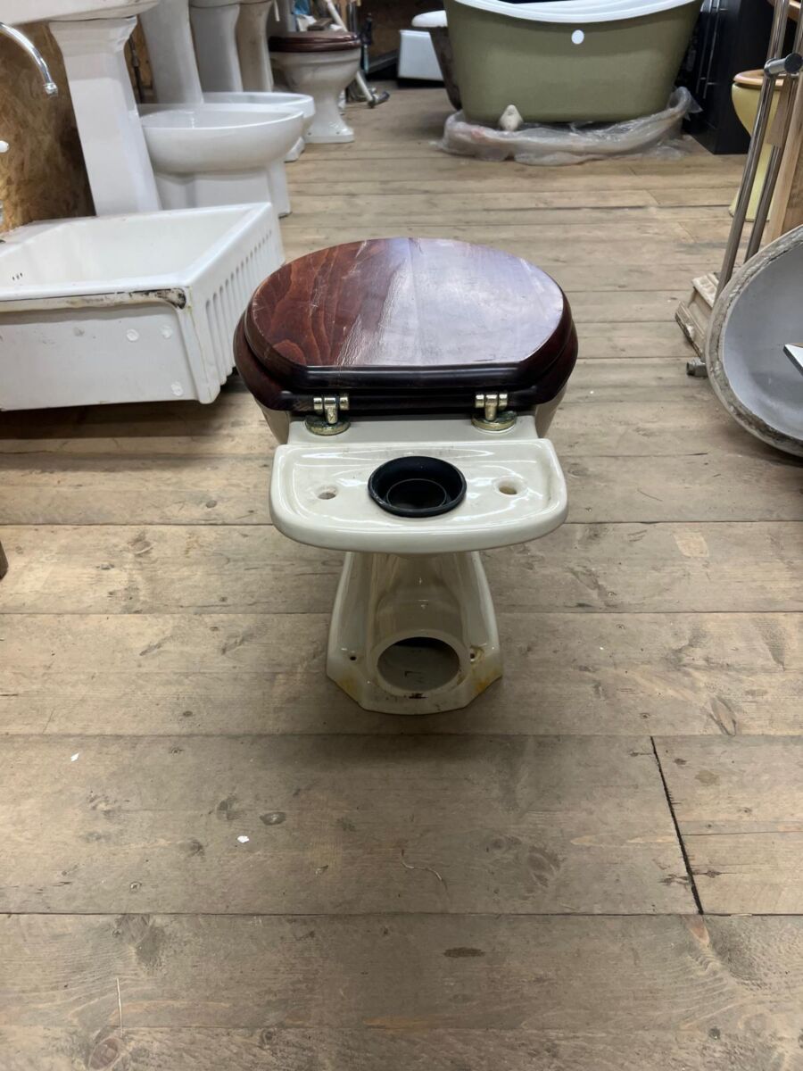 Here we have this Traditional Toilet in stock and on display in our antique sanitary ware area here at Authentic Reclamation. This traditional toilet is in good condition with light marks to the ceramic and wear to the wooden seat, which can be seen in the images. This traditional toilet has a reassuringly solid presence, with its softly shaped ceramic form paired with a dark wooden seat that adds warmth and contrast.