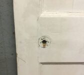 Here we have a White 4 Panel Door, available and on display in our door bay here at Authentic Reclamation. This door is in okay condition with some damaged. One of the corners has been edited.